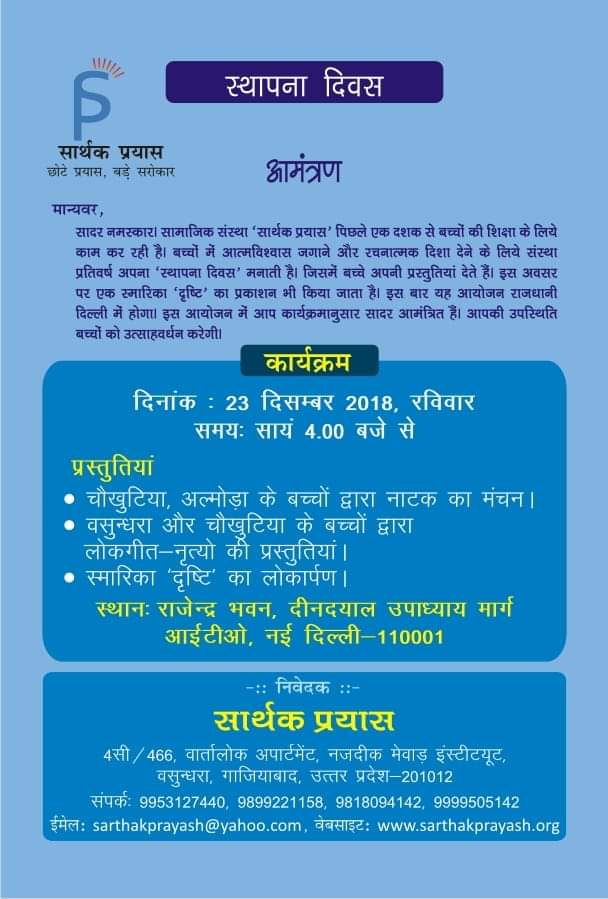 Annual Day Celebration – 2018 December 15, 2018 | No Comments Sarthak Prayash will celebrate its upcoming Annual day function on 23rd December 2018 at Rajendra Bhawan, New Delhi. Categories:Upcoming Event